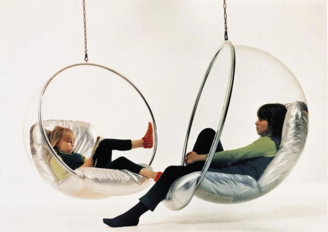 后来阿尼奥又发现,球形椅的光线太暗,没办法在里面舒适地阅读,于是在1968年,他又开始使用另外的透光材料,尝试让球形椅子允许光线穿过,升级版的泡泡椅就是这样诞生的。