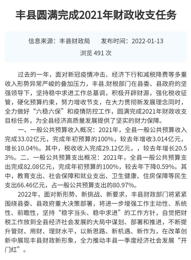 丰县这地方,不仅民风鄙陋,地方也不富裕。今天去丰县政府官网看了一下,2021年财政收入33.02亿元,支出82.08亿。