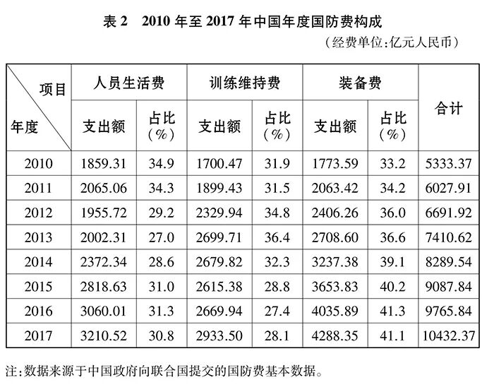 2012年至2017年,中国国防费从6691.92亿元人民币增加到10432.37亿元人民币。中国国内生产总值(GDP)按当年价格计算年平均增长9.04%,国家财政支出年平均增长10.43%,国防费年平均增长9.42%,国防费占国内生产总值平均比重为1.28%,占国家财政支出平均比重为5.26%。国防费占国内生产总值的比重稳定,与国家财政支出保持同步协调增长。