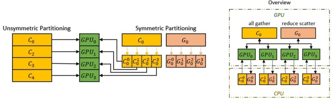 与 PyTorch 最新发布的 DTensor 类似,Colossal-AI 也使用了 device mesh 对集群进行了抽象管理。具体来说,Colossal-AI 使用 sharding spec 对 tensor 的分布式存储状态进行标注,使用 shape consistency manager 自动地对同一 tensor 在不同 sharding spec 间进行转换。这让 Colossal-AI 的通用性和易用性极大地提升,借助 shape consistency manager 可以没有负担地切分 tensor,而不用担心上游 op 的 output 与下游的 input 在集群中的存储方式不同。