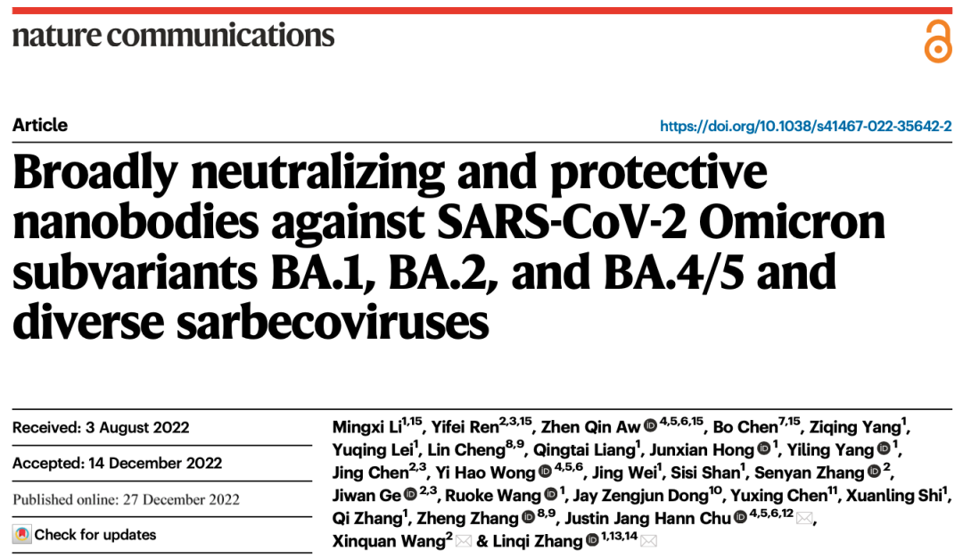 2022年12月27日,清华大学医学院张林琦教授/生命科学学院王新泉教授研究团队在Nature Communications(自然-通讯)杂志在线发表题为Broadly neutralizing and protective nanobodies against SARS-CoV-2 Omicron subvariants BA.1, BA.2, and BA.4/5 and diverse sarbecoviruses(针对新冠病毒奥密克戎变异株及多种冠状病毒具有广谱中和能力和保护能力的纳米抗体)研究论文。该研究从免疫羊驼体内分离鉴定纳米抗体,对SARS-CoV-2多种变异株、SARS-CoV-1和其他主要sarbecovirus病毒具有广谱高效中和活性。其中代表性抗体3-2A2-4识别受体结合域RBD(Receptor binding domain)蛋白上高度保守的表位,保护K18-hACE2转基因小鼠免受Omicron和Delta活病毒感染,并对目前国内外出现的多种突变株BF.7,BQ.1.1和XBB等仍保持高效的中和活性,为研发新一代SARS-CoV-2纳米抗体药物提供了理想的候选。