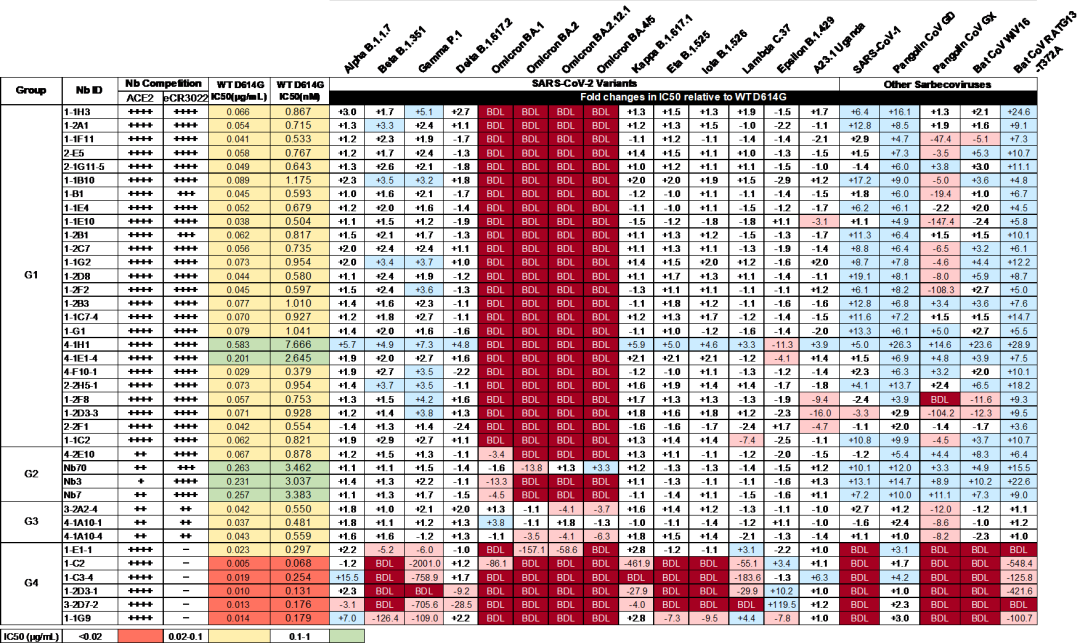 图1. 鉴定获得的纳米抗体对SARS-CoV-2变异株和其他sarbecovirus具有广谱中和活性