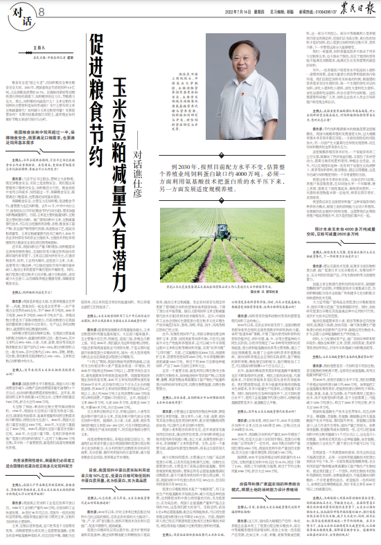 谯仕彦:2018年以来,针对玉米和豆粕在配合饲料中占比过高的情况,在农业农村部的大力推动下,“政、产、学、研”密切配合,组织开展技术攻关和示范推广,促进开源替代、提效减量。