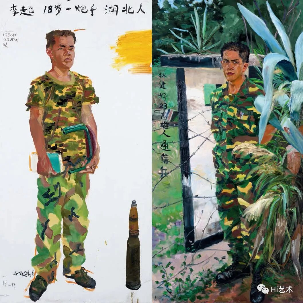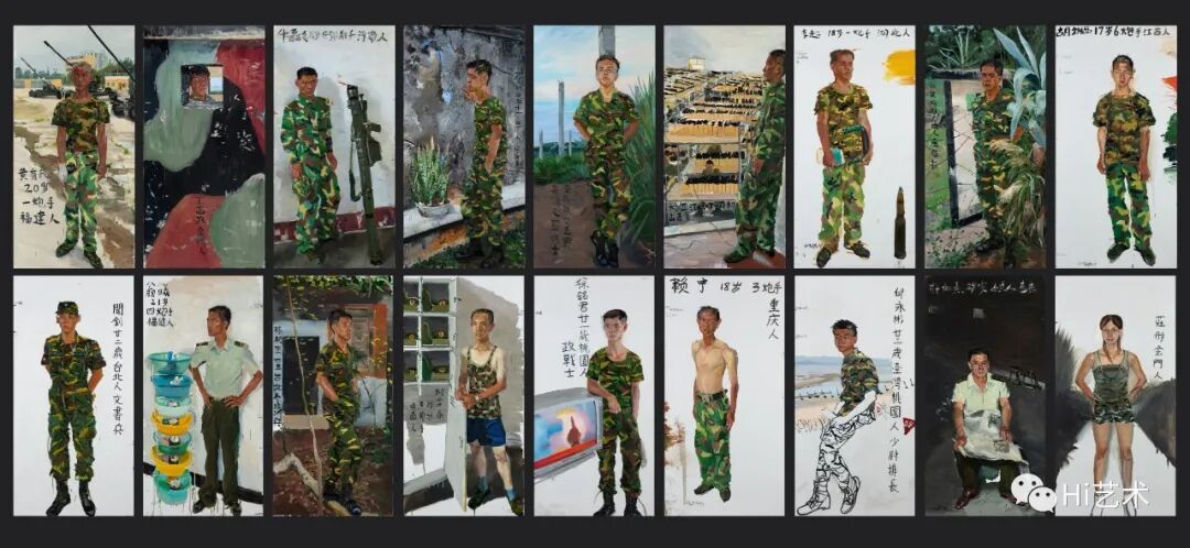 刘小东把自己想象成战地画家,去画最难处理的军事题材。他分别在两个军事基地观察年轻战士的日常训练与生活,写生对象为北京南苑机场附近的炮兵连、驻扎金门的台湾士兵。画面有每位士兵亲手写下的姓名、军种、籍贯。
