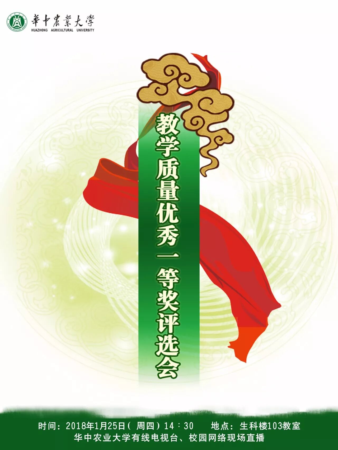 学校一年一度教学质量优秀一等奖评选会将于2018年1月25日(本周四,后天)下午14:30在生科楼103教室举行,欢迎各位老师莅临现场观摩指导~届时华中农业大学校园网、有线电视台将同步现场直播。
