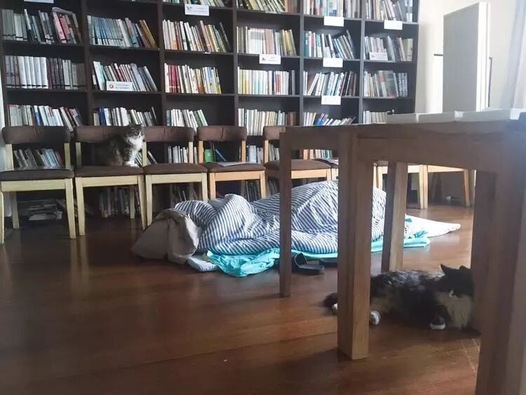 卡门是邬方荣养的长毛猫,黑黄白三色相间,已经十几岁了。麻圆是它的儿子。它们经常肚皮朝上倒在咖啡区的长桌上酣睡,或毫不客气地蜷缩在某个住客的地铺上,成为相互陌生的人们开启谈话的引子。