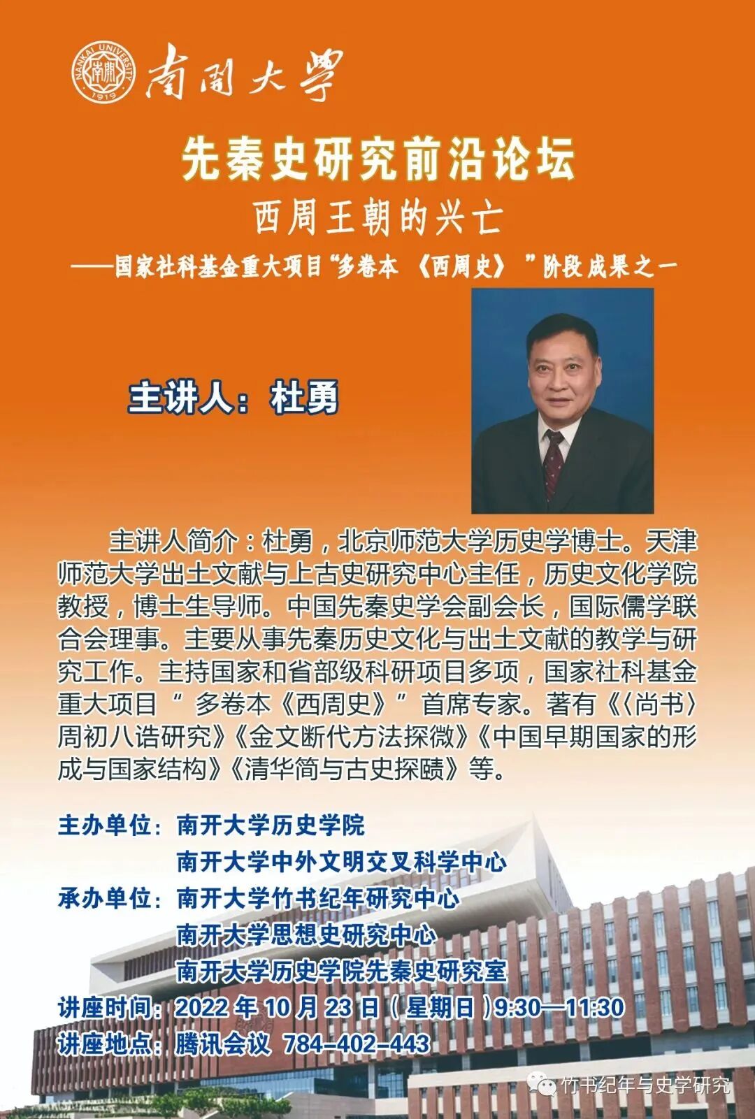 杜勇,北京师范大学历史学博士。天津师范大学出土文献与上古史研究中心主任,历史文化学院教授,博士生导师。中国先秦史学会副会长,国际儒学联合会理事。主要从事先秦历史文化与出土文献的教学与研究工作。主持国家和省部级科研项目多项,国家社科基金重大项目“多卷本《西周史》”首席专家。著有《〈尚书〉周初八诰研究》《金文断代方法探微》《中国早期国家的形成与国家结构》《清华简与古史探赜》等。