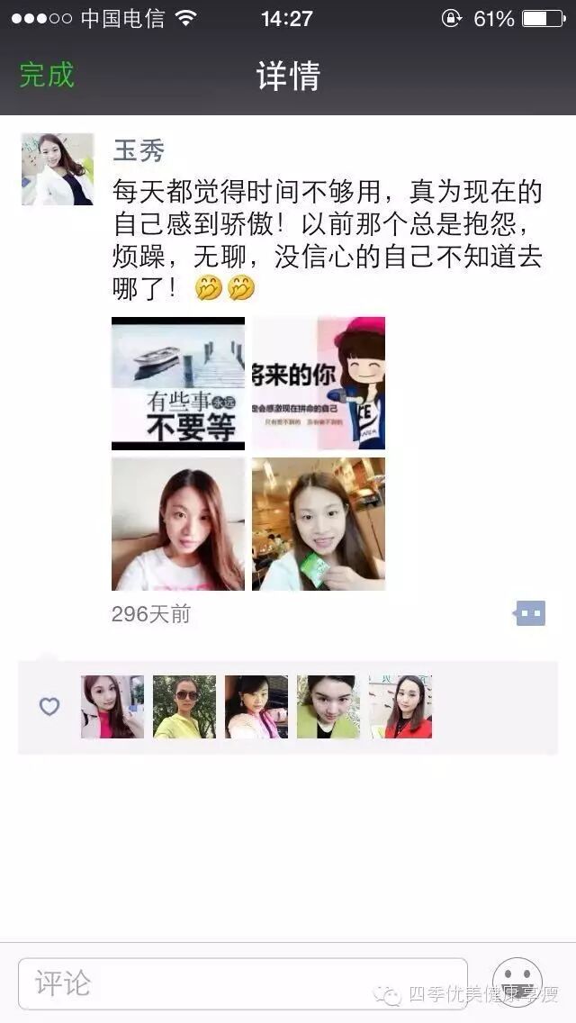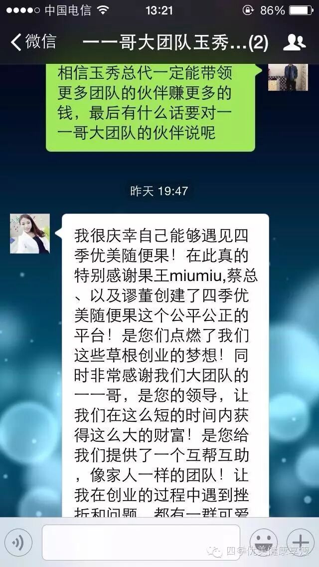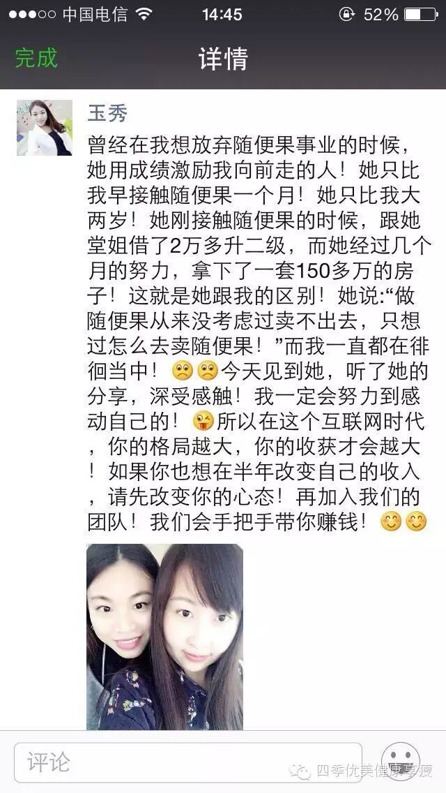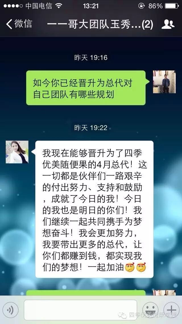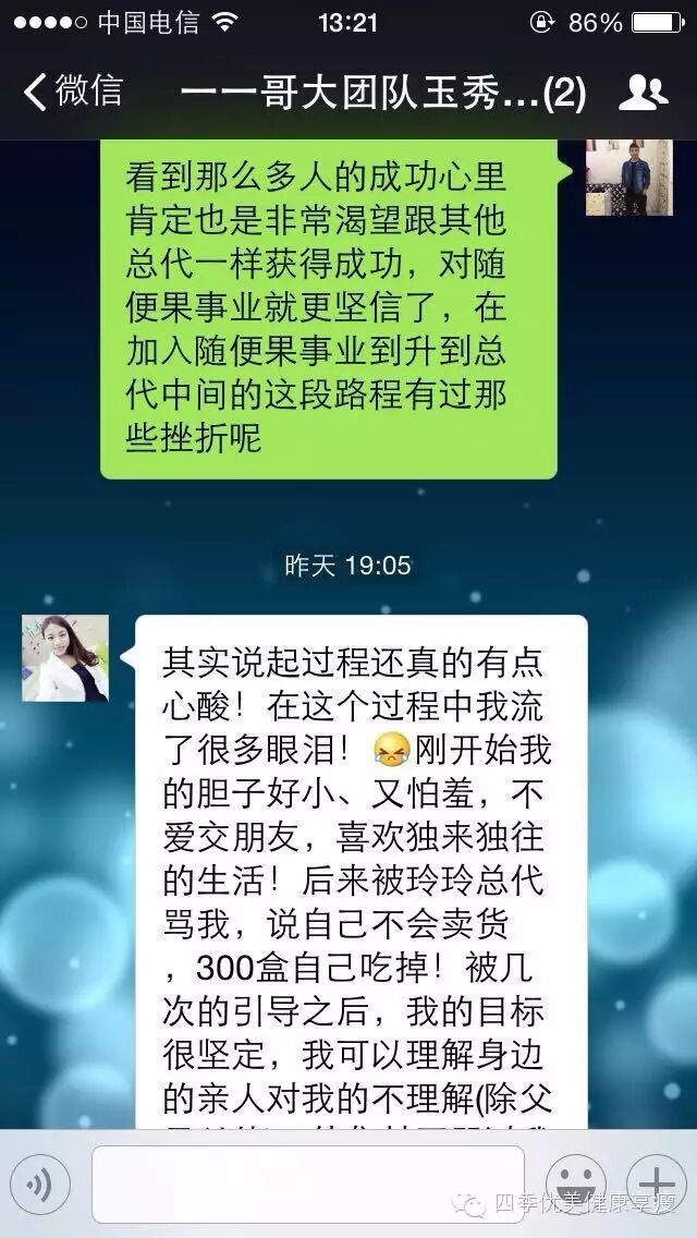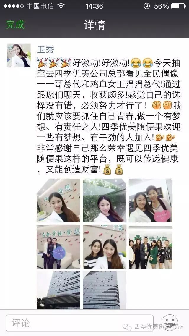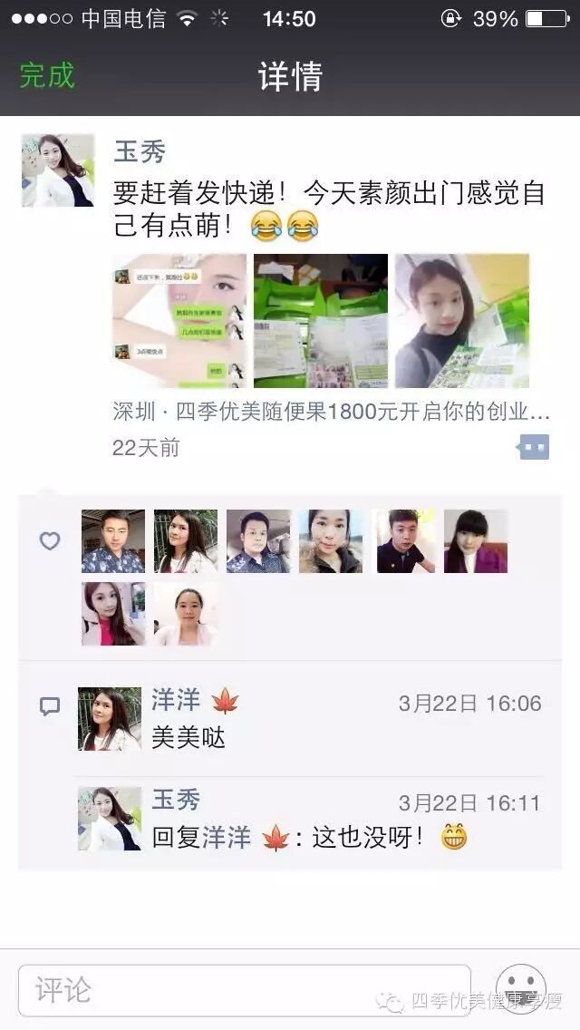 小编在这之后还有采访过玉秀的领路人玲玲总代(十一期总代)据玲玲总代讲解玉秀是一个非常有孝心的女孩子,很懂的关系别人,我想也正是因为她的关心让跟多的伙伴愿意跟随她,玉秀也是在通过自己坚持不懈的努力改变自己改变自己的现状让自己获得更多自己想要的,接下来让我们通过玉秀的朋友圈一起来看看她的改变吧 ....