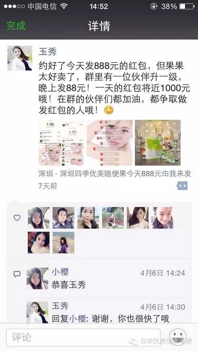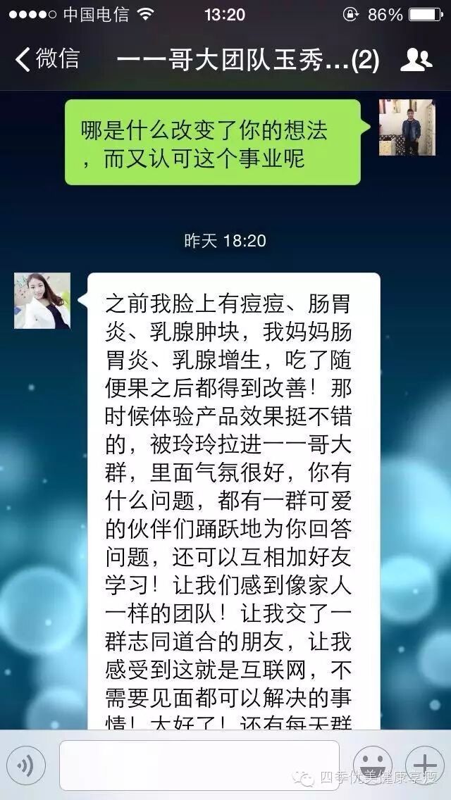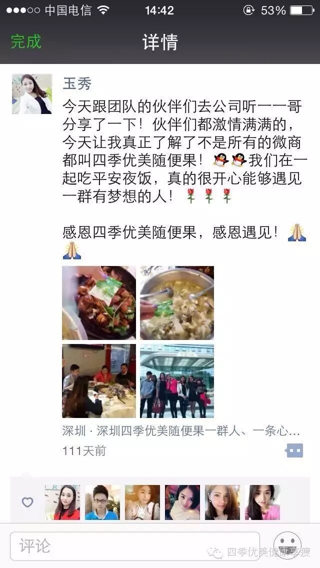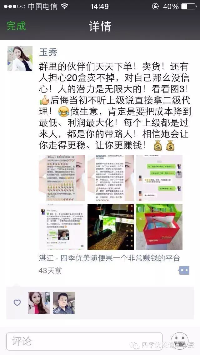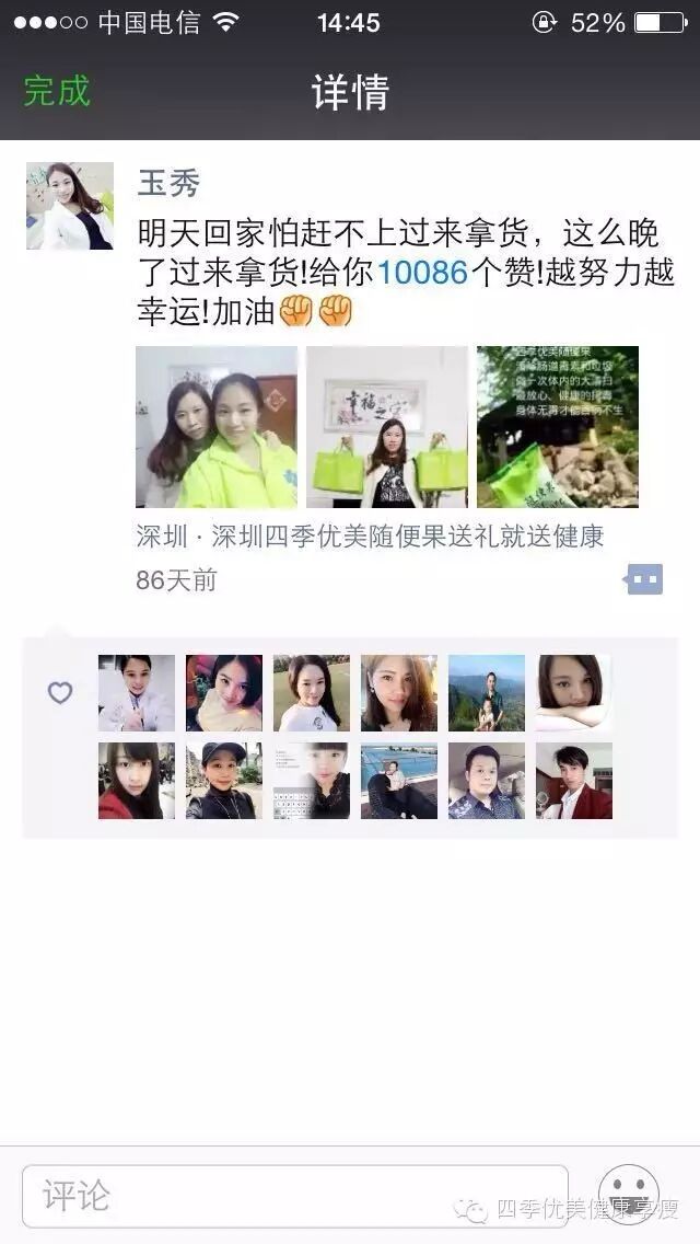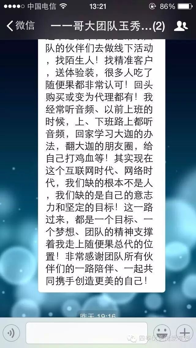 小编在这之后还有采访过玉秀的领路人玲玲总代(十一期总代)据玲玲总代讲解玉秀是一个非常有孝心的女孩子,很懂的关系别人,我想也正是因为她的关心让跟多的伙伴愿意跟随她,玉秀也是在通过自己坚持不懈的努力改变自己改变自己的现状让自己获得更多自己想要的,接下来让我们通过玉秀的朋友圈一起来看看她的改变吧 ....