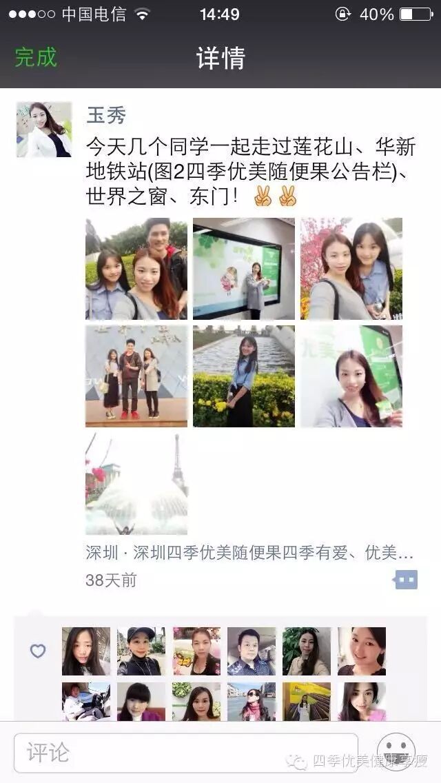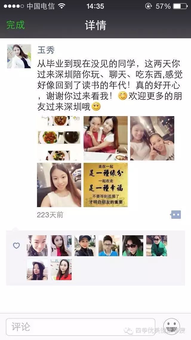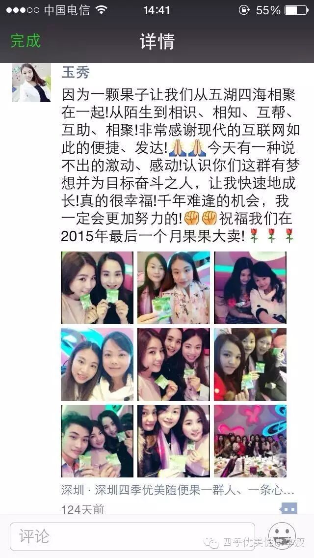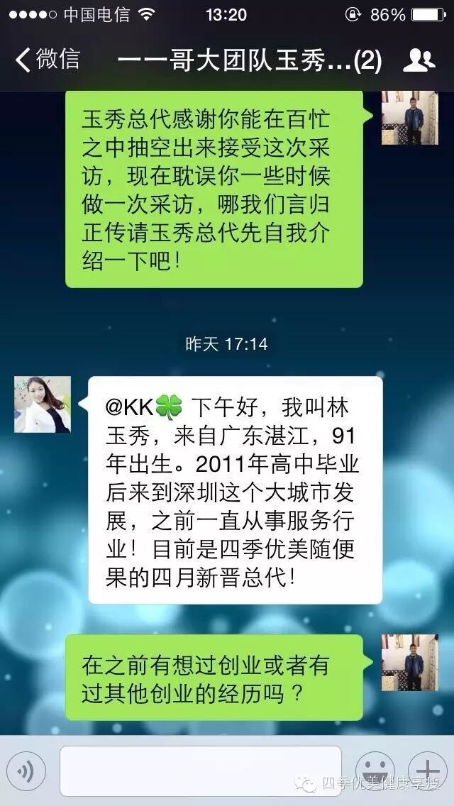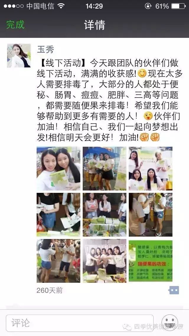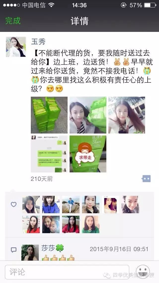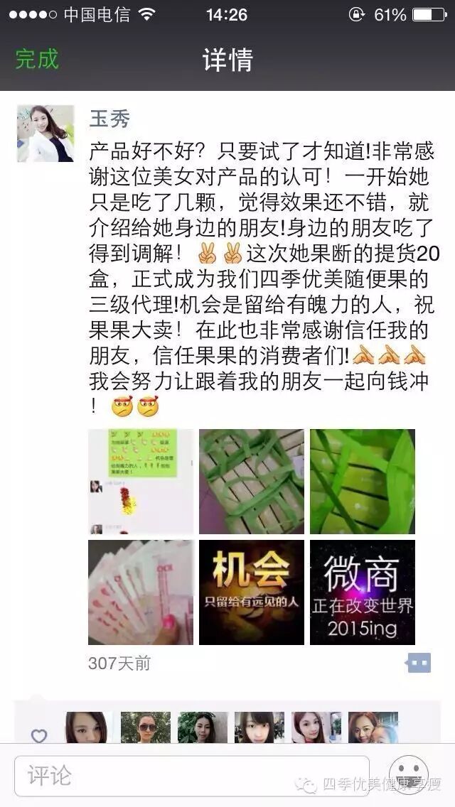 小编在这之后还有采访过玉秀的领路人玲玲总代(十一期总代)据玲玲总代讲解玉秀是一个非常有孝心的女孩子,很懂的关系别人,我想也正是因为她的关心让跟多的伙伴愿意跟随她,玉秀也是在通过自己坚持不懈的努力改变自己改变自己的现状让自己获得更多自己想要的,接下来让我们通过玉秀的朋友圈一起来看看她的改变吧 ....