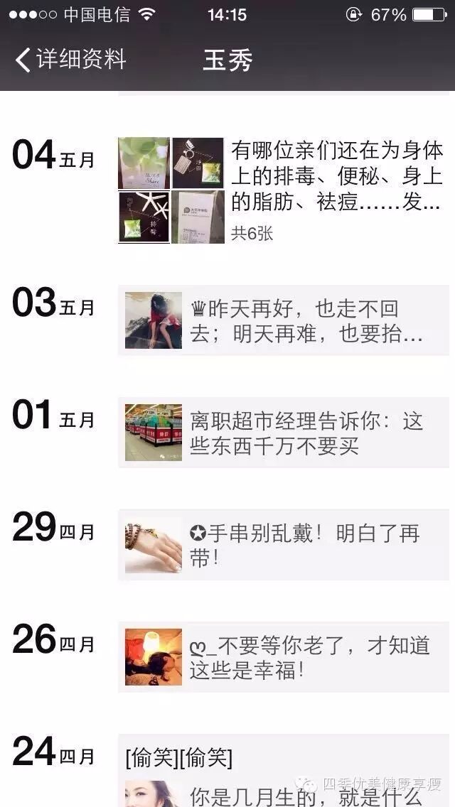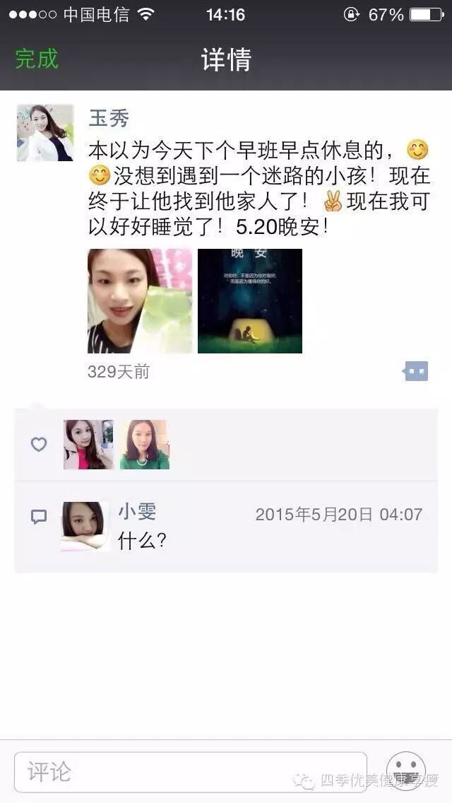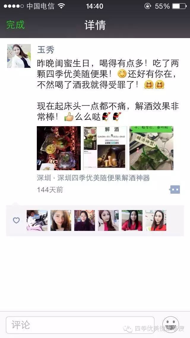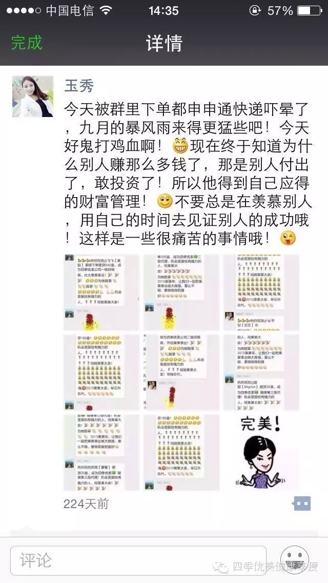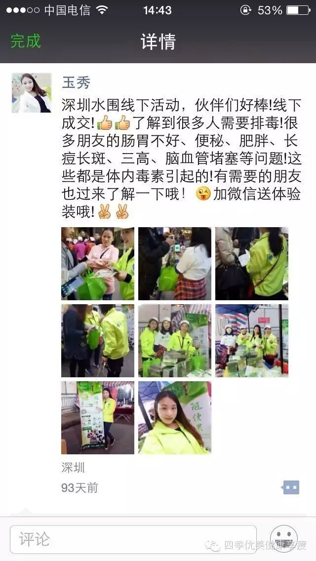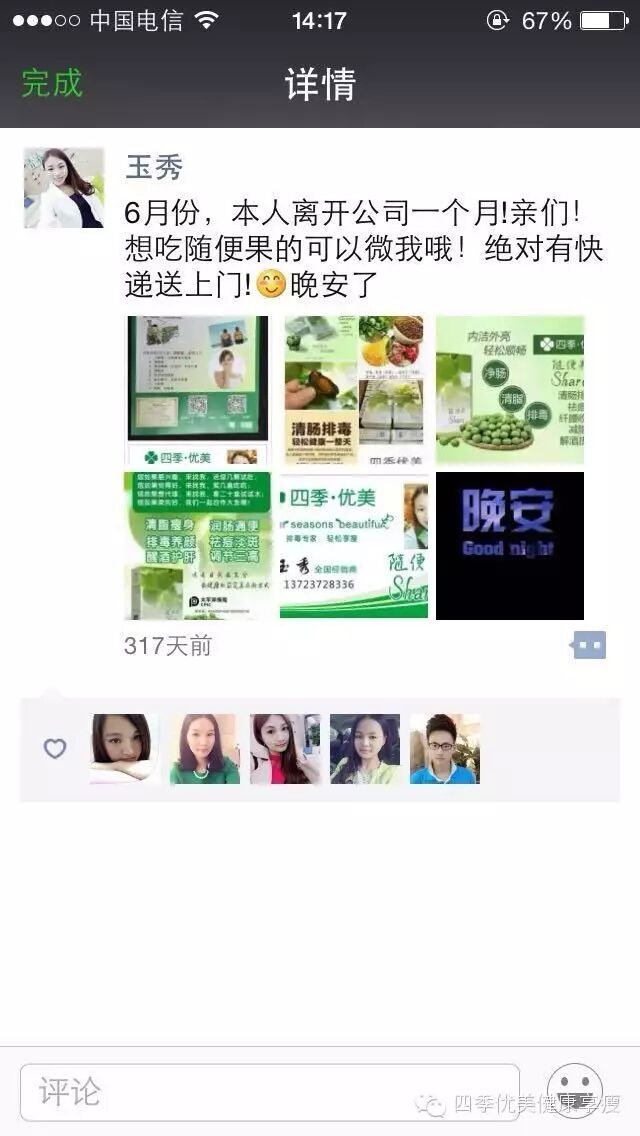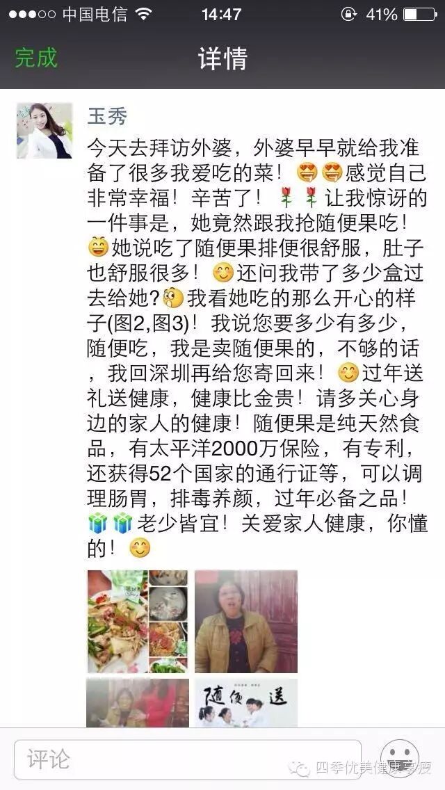 小编在这之后还有采访过玉秀的领路人玲玲总代(十一期总代)据玲玲总代讲解玉秀是一个非常有孝心的女孩子,很懂的关系别人,我想也正是因为她的关心让跟多的伙伴愿意跟随她,玉秀也是在通过自己坚持不懈的努力改变自己改变自己的现状让自己获得更多自己想要的,接下来让我们通过玉秀的朋友圈一起来看看她的改变吧 ....
