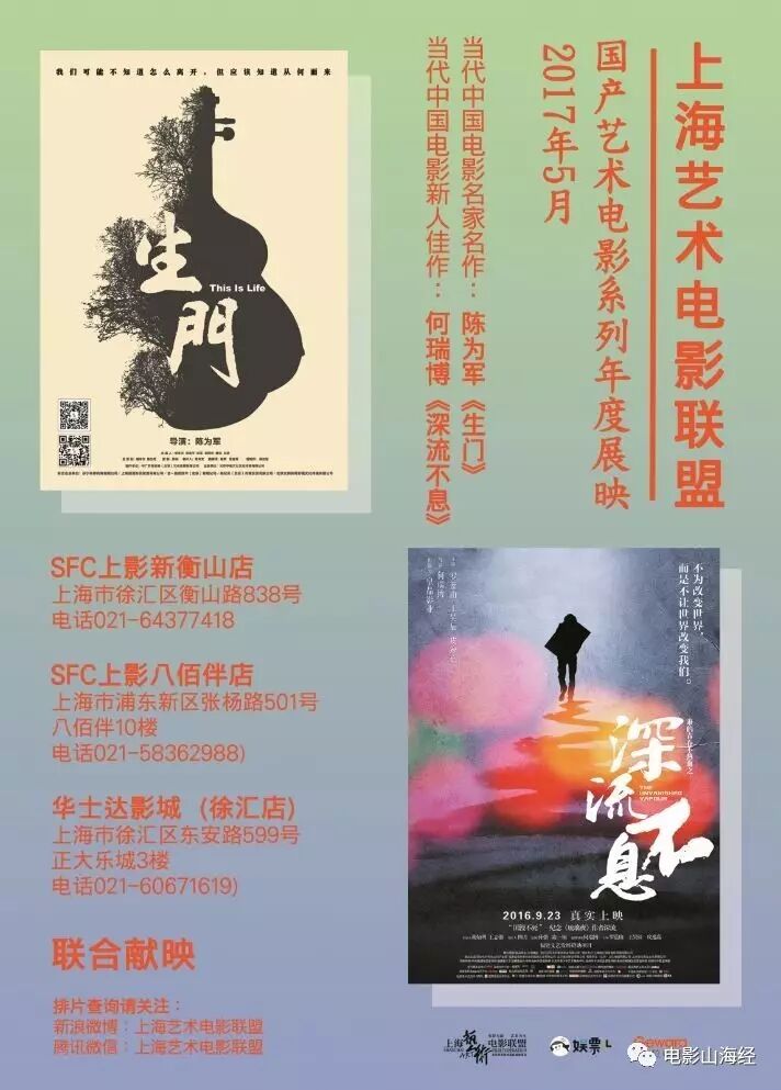 5月上海艺术电影联盟的国产艺术电影展映片目是《生门》和《深流不息》。与《生门》导演陈为军的最初相识,是2009年的《世界上最大的中餐馆》上海首映,因此本想邀请他来上海做映后交流,但因为他在国外治病而放弃了。