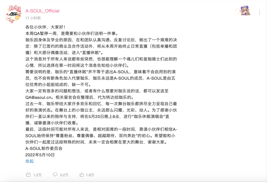 ▲2022年5月10日,A-SOUL宣布珈乐因身体及学业原因进入“休眠”。微博话题阅读量破千万并登上热搜榜。图/B站A-SOUL_Official“个人空间”截图