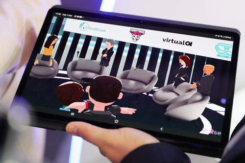 ▲3月1日,一家西班牙展商在西班牙巴塞罗那2022世界移动通信大会上用平板电脑展示会议室场景中的虚拟数字人。图/新华社