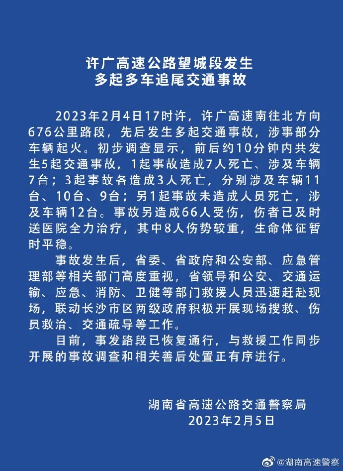 马捷强调,当前正值春运期间,全国“两会”召开在即,阶段性低温雨雪天气正在持续,一些重点领域的安全风险随之升高,做好春运安全生产各项工作极端重要。各地、各部门、各单位要认真贯彻落实庆伟书记、伟明省长批示精神,不断提高政治站位,始终保持舍我其谁的使命感、如履薄冰的紧迫感和重任在肩的责任感,以对人民生命安全极端负责的态度、坚决有力的举措、抓铁有痕的作风,毫不放松抓好交通运输安全生产各项工作。马捷要求,一是要高度重视、提高站位。要全面学习、全面领会、全面贯彻、全面落实习近平总书记关于安全生产工作的重要论述,坚持以人民为中心的发展思想,坚持人民至上、生命至上,不断增强“四个意识”、坚定“四个自信”、拥护“两个确立”、做到“两个维护”。二是要紧急调度、举一反三。要深刻汲取长沙市“2·4”许广高速望城互通处多起多车追尾事故教训,加强与气象、应急、网信等部门的协调联动,做好低温雨雪、冰冻团雾等极端天气预测预警、应急保障和舆情监测处置工作。各分管厅领导要认真贯彻落实省领导指示批示精神,分块分线进行调度,全方位全覆盖开展安全生产检查,压实工作责任,确保万无一失。三是要抓住关键、严防死守。要加强对全系统从业人员的安全培训和警示教育,提升驾驶员在恶劣天气、湿滑路面、制动失效等突发情况下的应急处置能力;要紧盯易引发群死群伤事故的风险点,聚焦“两客一危”车辆、水上客渡运、工程建设等重点领域、重点对象,加强道路运输、水上运输、在建工程的安全管理和路段巡查,强化安全监管和风险隐患排查整治;要强化应急值守工作,加强重大灾情和工作情况报送,畅通信息报送渠道,加快信息传递速度,提高信息的及时性、准确性。2月5日下午,湖南省高速公路交通警察局通报,许广高速公路望城段发生多起多车追尾交通事故,已造成16人死亡、66人受伤。据通报,2月4日17时许,许广高速南往北方向676公里路段,先后发生多起交通事故,涉事部分车辆起火。初步调查显示,前后约10分钟内共发生5起交通事故,1起事故造成7人死亡、涉及车辆7台;3起事故各造成3人死亡,分别涉及车辆11台、10台、9台;另1起事故未造成人员死亡,涉及车辆12台。事故另造成66人受伤,伤者已及时送医院全力治疗,其中8人伤势较重,生命体征暂时平稳。事故发生后,湖南省委、省政府和公安部、应急管理部等相关部门高度重视,湖南省领导和公安、交通运输、应急、消防、卫健等部门救援人员迅速赶赴现场,联动长沙市区两级政府积极开展现场搜救、伤员救治、交通疏导等工作。目前,事发路段已恢复通行,与救援工作同步开展的事故调查和相关善后处置正有序进行。来源:聊时局综合“湖南交通运输”微信公号、@湖南高速警察