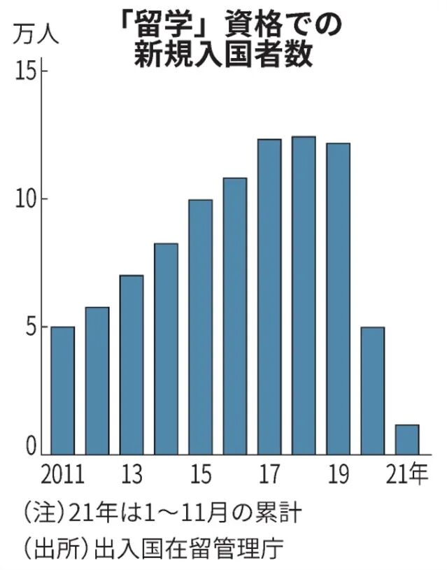 在严格的留学入境政策对教育行业带来的打击中,首当其冲的是日本语言学校。尚未申请日本大学或研究生院等高等教育机构,而仅仅在计划学习日语阶段的“准留学生”,与许多已经获得日本高等教育“入场券”,拿到留学资格的留学生不同——对他们来说,放弃赴日的损失很小,毕竟去哪个国家都是从头学起。日语教育振兴协会2021年10月的调查显示,在接受调查的87所语言学校预计招收的8400名学生中,有约6成在疫情后放弃了赴日计划。新生数量更加触目惊心:接受调查的184所语言学校的新生人数较去年平均降低了96.7%;超过半数的机构表示,如果这一情况在一年内得不到改善,他们将无以为继。