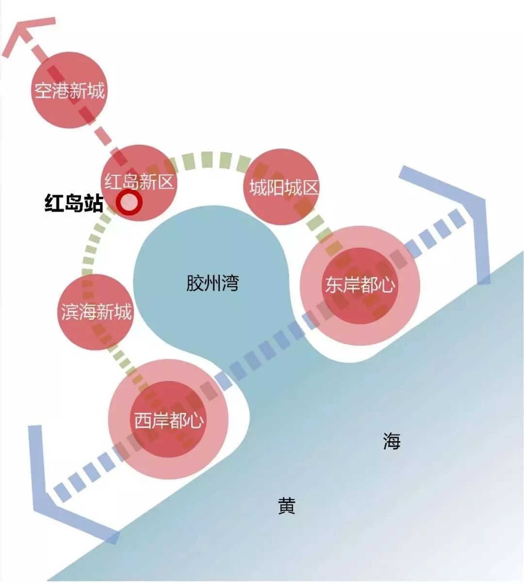 “大青岛”区域发展战略为全域统筹、三城联动、轴带展开、生态间隔、组团发展;以胶州湾为核心,东岸、西岸、北岸三大城区功能互补、相互依托、各具特色。红岛处于三城联动的枢纽位置,红岛站是未来整个“大青岛”区域重要的交通枢纽。