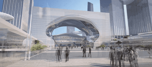云门提供了标志性、公共性、开放性的城市空间,其前侧中间广场可适应不同活动的需求,户外空间植入不同的城市主题活动,为城市空间注入活力。