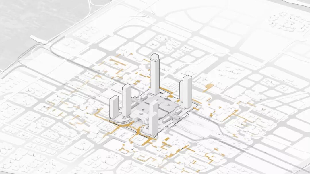 到城的车流则在高架快速路提前分流至地面,再由地面道路进入各个街区。
