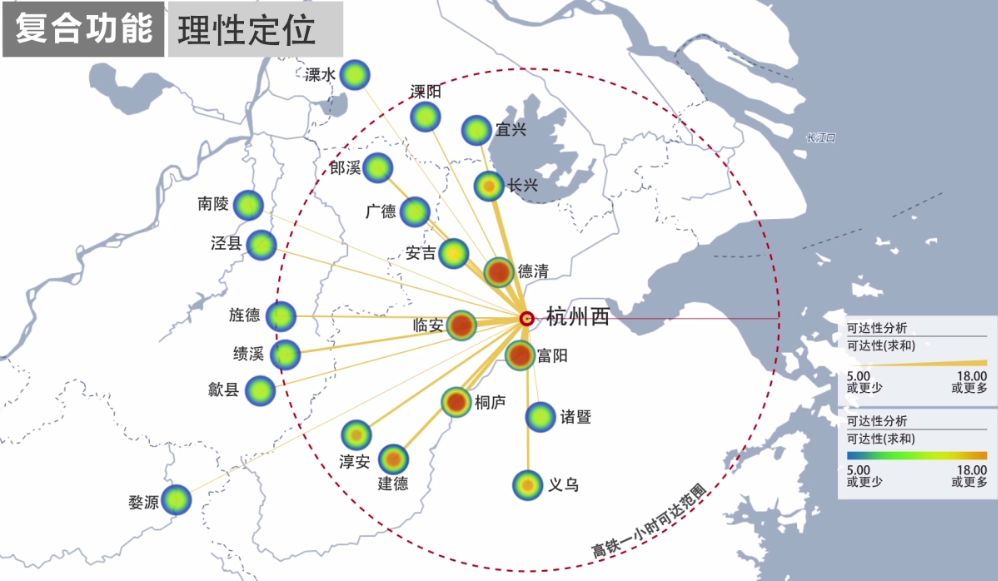 随着高铁的开通,未来,杭州西站综合体必将发展成为长三角一体化的重要枢纽、科创大走廊的发展引擎、杭州“旅游西进”的产业旗舰。为更好地利用西站对土地开发的导向效应,我们根据对周边城市不同能级与可达性的量化研究,细化高铁区域城市功能需求,并以此为依据规划综合体的功能布局。