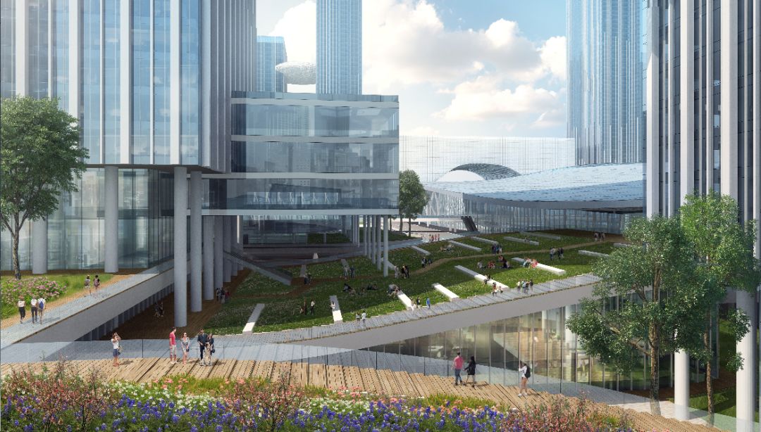 以枢纽综合体为核心,在地面之上6米高度之处,构建区域高架慢行系统。通过高架慢行系统实现人车分流,地面层机动车畅通无阻,6米标高层,构建连贯的步行友好环境,并且妥善结合建筑屋顶花园的设计,构架立体多维的城市空间。