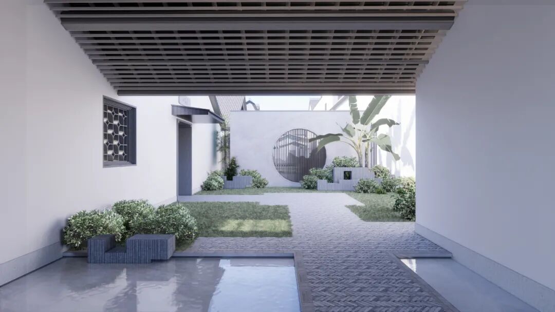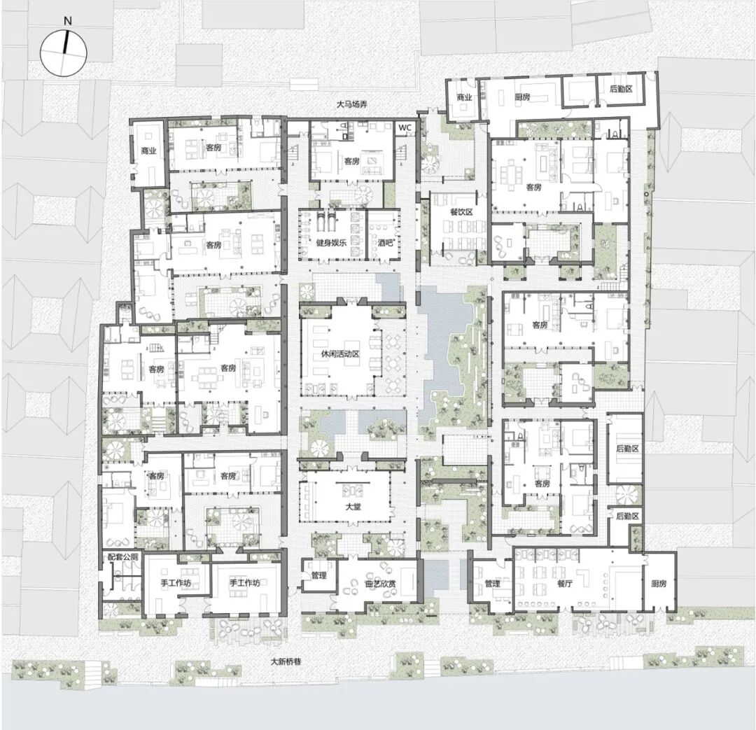 同时,融入差异性的功能布置,营造具有传统宅院特点及家园感的旅居生活场所,使一层客房享有独立庭院,二层客房则围绕庭院紧凑布置,这样既呈现原有老宅的庭院、檐廊、门楼、天井,同时又融入当代的生活方式;最后,结合街巷融入若干商业功能,激活沿河及巷弄空间活力,呈现即具有历史感又贴合当代使用的建筑场所。