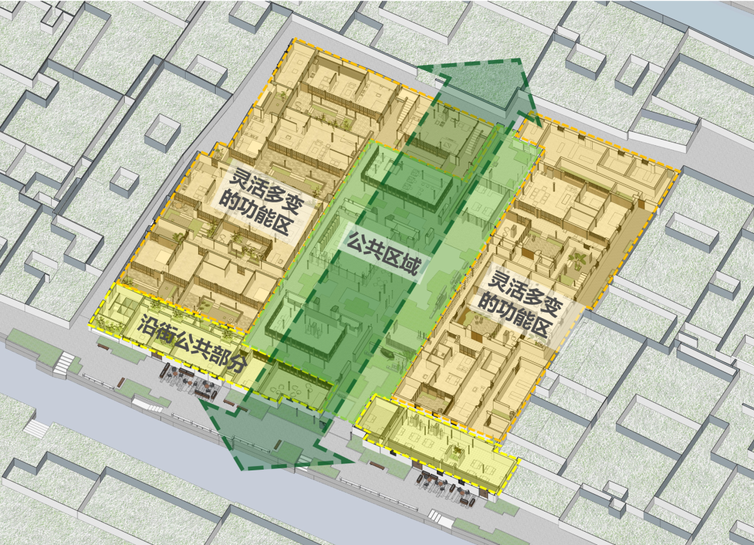 整体的联接——建立中部公共空间与两侧客房单元相结合的布局形式,该布局形式在适应未来使用方式的多种变化可能的同时,中部公共区域也连接了南北街巷空间,激活了周边街巷空间;