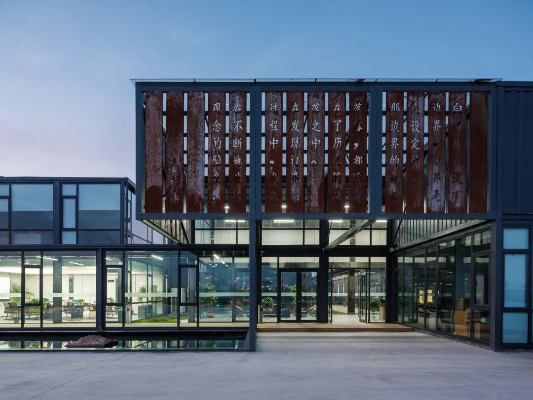 主入口门头,我们做了突破集装箱技术参数的大悬挑,并在悬挑处外挂耐候钢板,钢板上镂刻文字。在孔子故里、诗仙故乡,门头上这句话我们有太多的选择了,但最终这些名人名言都没有入围,我们摘取了华侨城高强度知识风暴《吹水集》里的一句话,“自然从来没有边界,边界是人设定的,那边界的起起落落,都隐藏在了历史的角落之中。在发现边界的过程中,我也在不断地破除观念的壁垒”,而这句关于“无界”的话也扣题了我们在大片区打造的“欢乐无界”十里文化生态画廊。
