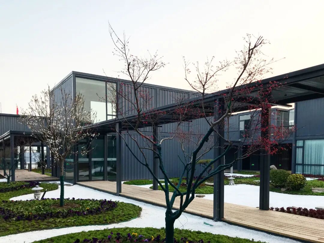 设计前置条件很明确:小2000㎡功能面积、2种集装箱模数、1块小学操场用地、形成庭院。拆题解题的思路也很清晰,功能归类、空间游走、核心强化、场地制高。模块化的组装方式叠加中式园林的空间游走、工业风的硬朗粗犷浸入庭院深深的细腻温婉、极度人工的几何尺度对话极度自然的别有洞天,这些无一不在冲破着传统的认知预期、极致着场域的戏剧张力。