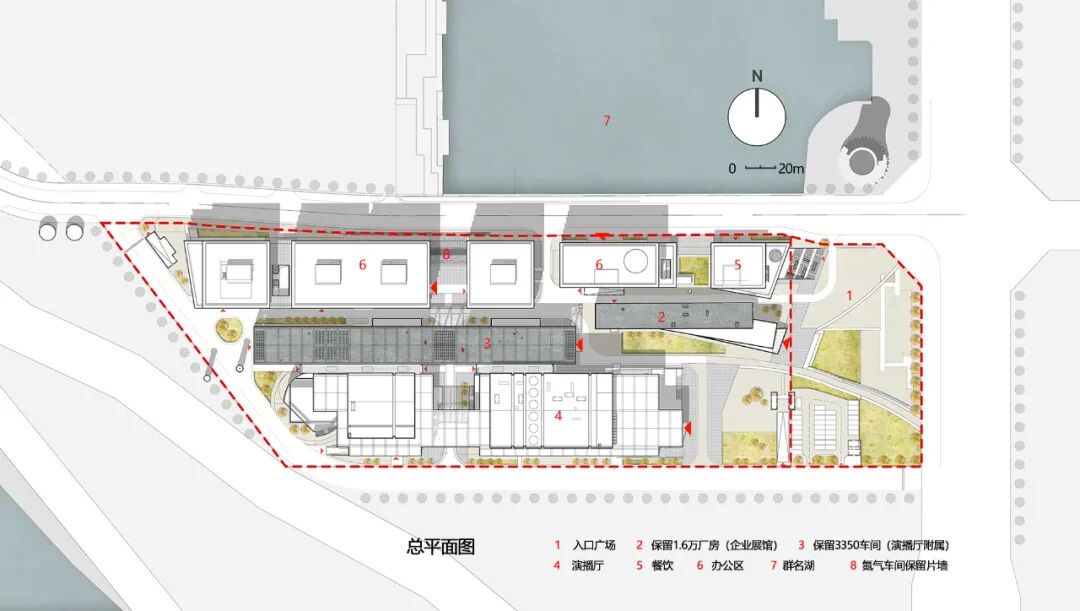 设计保留多处工业建筑及构架,新建建筑顺应原有肌理与保留建筑有机融合。在景观资源丰富的北侧临湖区域布置办公及配套商业;靠近长安街西延线的南侧区域,是整个长安街的收尾节点,因此将具有形象展示及人流量大的演艺中心放置于此处。入口结合广场,以旧工业厂房和群明湖为背景,营造具有个性的休憩空间。