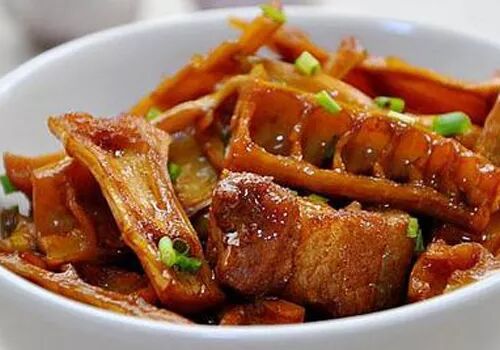 原料:五花肉,笋干菜,冬笋,干辣椒,蒜瓣,老姜,盐,白糖,生抽,料酒。