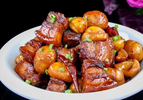 食材: 五花肉500克,板栗20克,姜适量,老抽2汤匙,