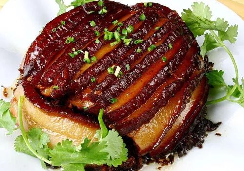1.将猪肉(五花肉)刮洗干净,放入清水中煮熟,捞出,去皮上的油水。马上抹上深色酱油使其上色。