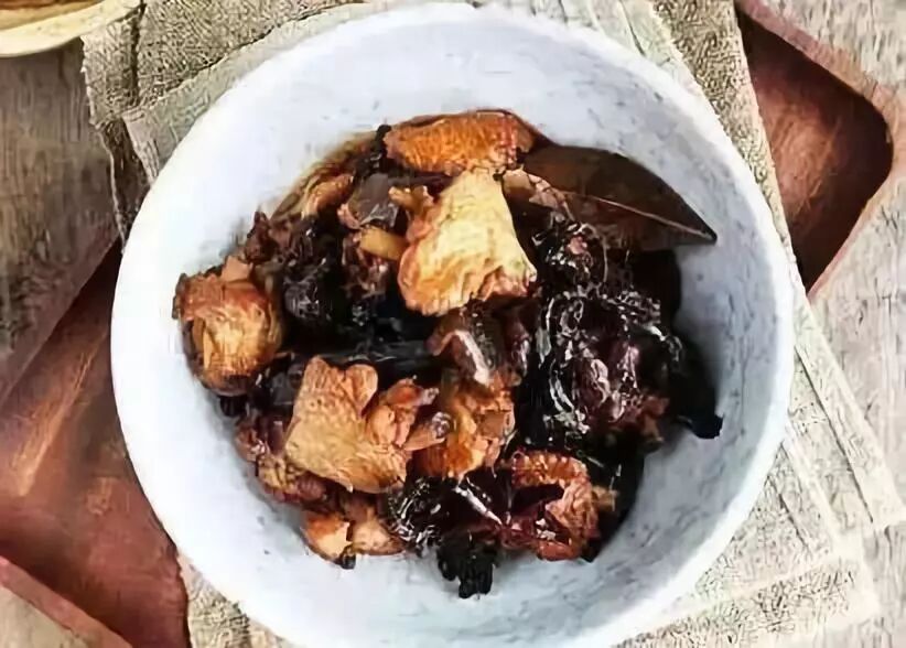 ✦鸡翅洗净,对半切开。干榛蘑提前浸水泡发。锅倒油烧热,放入姜片、八角、桂皮、香叶、花椒,小火煸香,放入鸡块和泡好的榛蘑,淋上生抽,烹入料酒,加入冰糖后翻拌均匀。