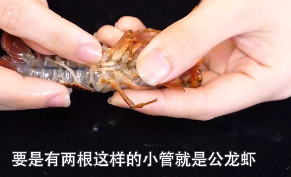 那这里很多人会说,网上都说这个是虾卵啊,没错,成熟的母虾确实是有虾卵的,但这只是公虾,所这个不可能是虾卵,那我们怎么区分公虾还是母虾呢,其实非常的简单,大家看到小龙虾腹部要是有两根这样的小管就是公龙虾,这个是公龙虾的生殖器。