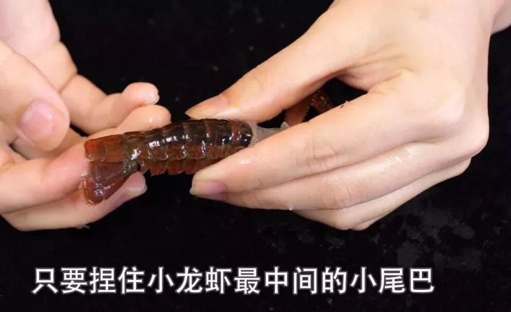 现在我们再来处理虾线,处理虾线也非常简单,只要捏住小龙虾最中间的小尾巴,然后这样拧半圈,就可以直接拉出虾线了,虾线就是小龙虾的肠道,也是非常脏的