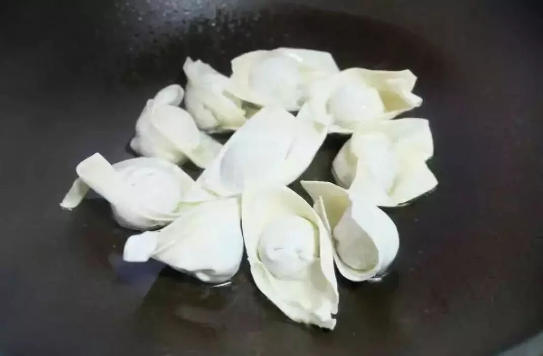 7、馄饨包好了,我们今天主要介绍抱蛋馄饨的做法。平底炒锅烧热,放上适量的食用油,微热后把馄饨摆上去,稍微煎1分钟左右;