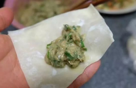 4、馄饨皮里包上调好味的馄饨馅;
