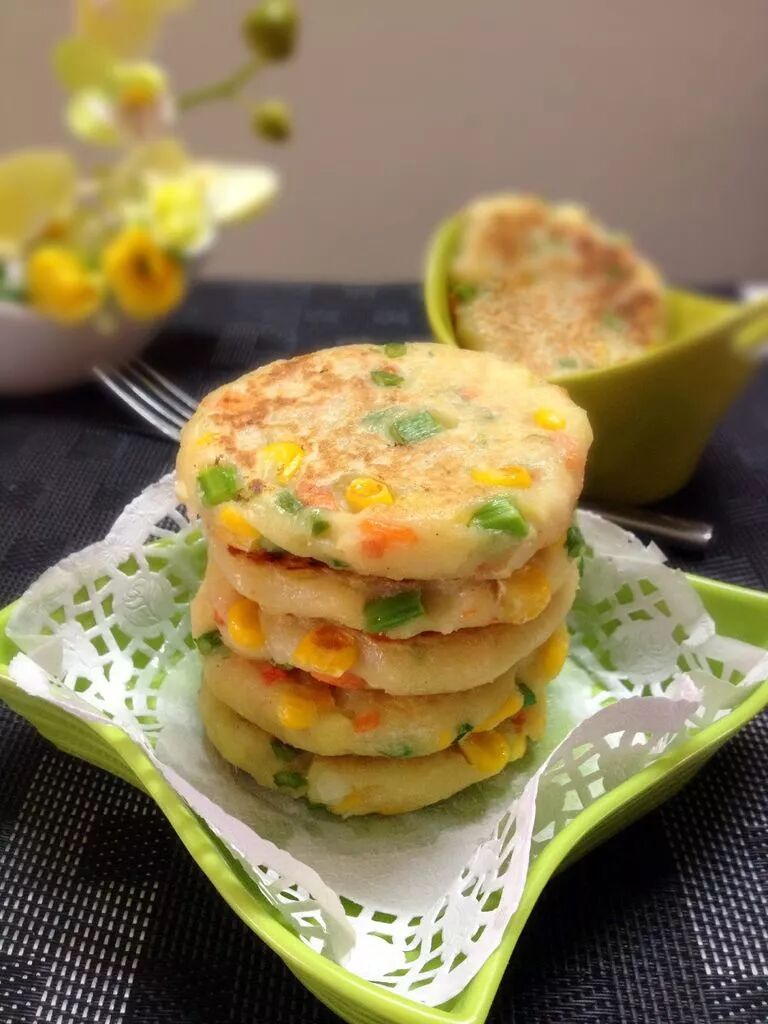 材料: 土豆泥,芦笋、玉米粒、胡萝卜、椰子油、盐、生抽、面粉 步 骤: 1、土豆煮熟压成泥。 2、准备其余食材,胡萝卜、芦笋切丁 3、胡萝卜、芦笋在开水中焯一下盛出滤干水分 4、把3种食材放入土豆泥中,放盐、生抽、面粉揉成团 5、分成几份搓圆压扁 6、平底锅放点油,放入土豆饼,小火煎 7、翻面煎到两面金黄即可