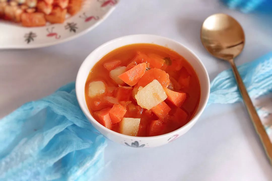 材 料: 胡萝卜一小根,土豆一个,玉米一根,番茄一个,盐适量,油适量 步 骤: 1、胡萝卜、土豆去皮改刀,玉米切块儿。 2、热锅,少油,加入胡萝卜快大火翻炒。 3、倒入土豆、玉米,继续大火翻炒1-2分钟。 4、倒入清水,盖上锅盖,大火烧开。 5、番茄去皮,捣碎。 6、加入到烧开的锅内,加入少许盐,继续中火炖15分钟,转小火在炖5分钟即可。7、低油少盐健康养生堂完成。