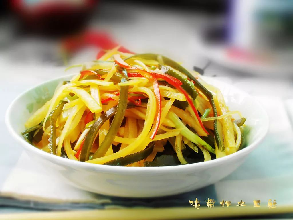 材料: 土豆1个,海带丝150克,红椒半个,芹菜2根,酱油、醋、辣椒油、盐、香油适量 步 骤: 1、海带在淡盐水中浸泡一会儿,再切段 2、红椒切丝;芹菜切段 3、土豆去皮切丝,过水洗去淀粉 4、土豆丝入沸水焯烫,捞出放盘中 5、海带丝和芹菜入沸水中焯烫,捞出沥水,放土豆丝上 6、加酱油、醋、盐、香油、辣椒油拌匀即可