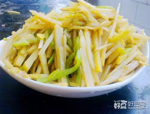 材 料: 土豆(中等大小)2个,白醋4勺,糖1勺,盐适量,植物油,小米椒3个 步 骤: 1、土豆洗净去皮切成细丝,冲洗两遍后再放入凉水中浸泡10分钟左右,浸去淀粉。2、锅里烧开水,放浸泡好的土豆丝焯水半分钟左右,断生即可,捞出沥干水。 3、把调好的糖醋汁放进土豆丝里拌匀,糖醋比例根据个人喜好而定。 4、锅里烧热油,放入干花椒炸至花椒变色出味。 5、关火,捞出花椒,稍停片刻,放入红椒段,利用油的余温炸辣椒。 6、最后把油跟辣椒一并倒入土豆丝中拌匀即可。
