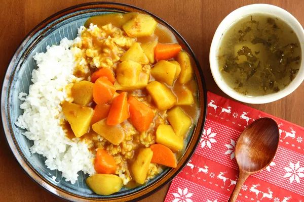 材 料: 工研素咖喱块1块,米饭一人份,土豆一大个约180g,胡萝卜半根约85g,食用油20ml 步 骤: 1、土豆和胡萝卜洗净去皮,切小块 2、煮锅倒入油,中火,胡萝卜和土豆倒入翻炒至土豆的切面有一半变白 3、加入300ml水,大火煮8分钟,至土豆和胡萝卜变软 4、煮锅离火,加入1块咖喱块,用勺搅拌至咖喱块完全融化 5、再将锅重新放回炉灶上,小火煮约5分钟,咖喱呈粘稠状即可盛出,浇在饭上。