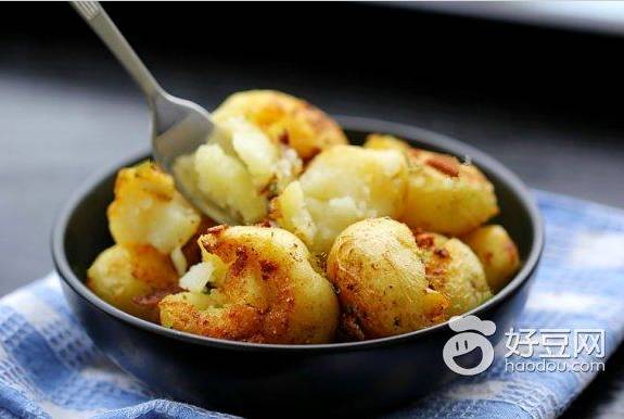 材 料: 小土豆300克,盐,孜然粉,黑胡椒碎,辣椒粉,椰子油 步骤: 1、把没削过皮的小土豆放入锅中,加入适量的橄榄油; 2、再加入素高汤,水量以没过土豆为好; 3、盖上锅盖,注意要留有小空隙,以免汤煮溢出来; 4、小火煮上二十分钟,关火,用铲将土豆按压,让其裂开; 5、再打开火,大火收汁,直到汤汁完全被土豆吸收,剩余油脂开始煎烤小土豆且表面微微发黄; 6、加入孜然粉、加入辣椒粉; 7、最后加入黑胡椒碎; 8、翻炒一下,土豆两面都煎至金黄色就可以出锅了。