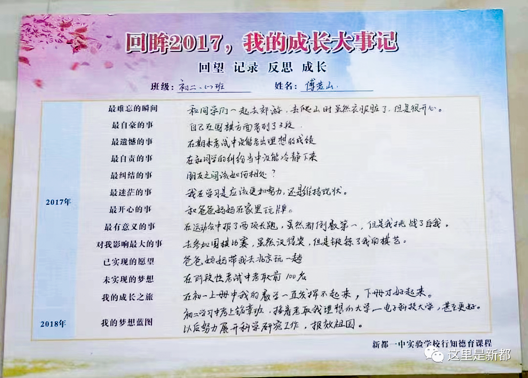 谈及大学,傅若山其实早在初二就有了自己的想法,他在“2017年成长大事记”中写到,自己执着的理想是考上一个好的大学,电子科技大学就是当时定下的首要目标。