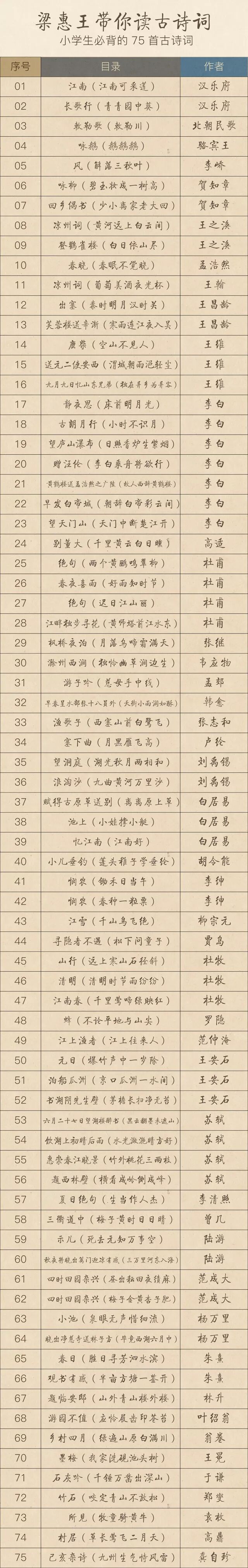 于是合作者建议我讲讲新课标小学生必背75首古诗词。希望我继续发扬寓教于乐的精神,把古诗词的精髓,用温水煮青蛙的方式,不知不觉灌输给他们。让他们在快乐中,浑然不觉自己的古典文化修养已经如春夜的韭菜,潜滋暗长,超出同龄人一个段位。