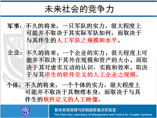 虚实二象性,整个人类文明就是这样来的。理性是有限的,智力必然也是有限的。人类的智力一定要通过平行的虚拟系统来扩展。大家想想因特网怎么发展起来的,从Bush的Memex发展起来的,平行智能就是再回到Memex的想法,就是建设一大批X 5.0智能系统,扩展人类智能。