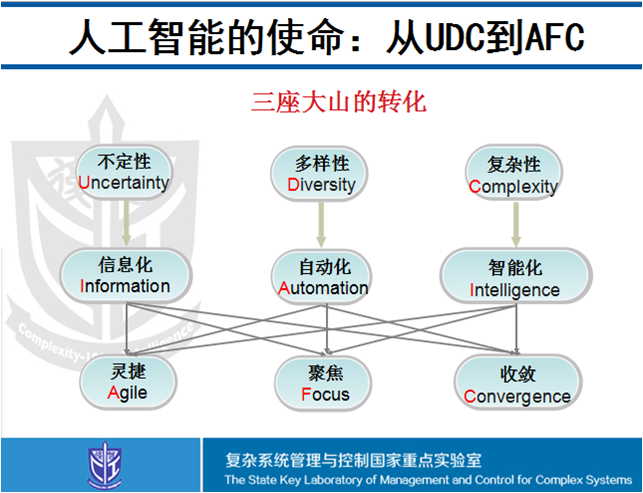 这些矛盾的特征归结起来就是UDC: 不定性(Uncertainty),多样性(Diversity)和复杂性(Complexity)。很大程度上,人工智能的使命就是把压在人类头上的UDC这三座大山,转化成AFC:具有深度知识支持的灵捷(Agility)、通过实验解析的聚焦(Focus)、能够反馈互动自适应的收敛(Convergence)。完成这一使命,必须是信息化、自动化、智能化的一体融合,从而化解复杂性和智能化的本质性矛盾,使“无解”的问题变得“有解”。