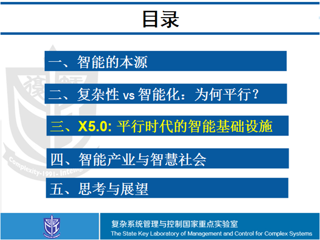 我今天讲的东西是自己和团队深入十余年所做工作的一些体会和思考,按照"流行"的思路表述,主要围绕平行智能系统X5.0展开讨论,并对未来人工智能的发展提一点看法。共识的东西这里少说,今天多讲非共识的东西,大致按五部分内容展开。