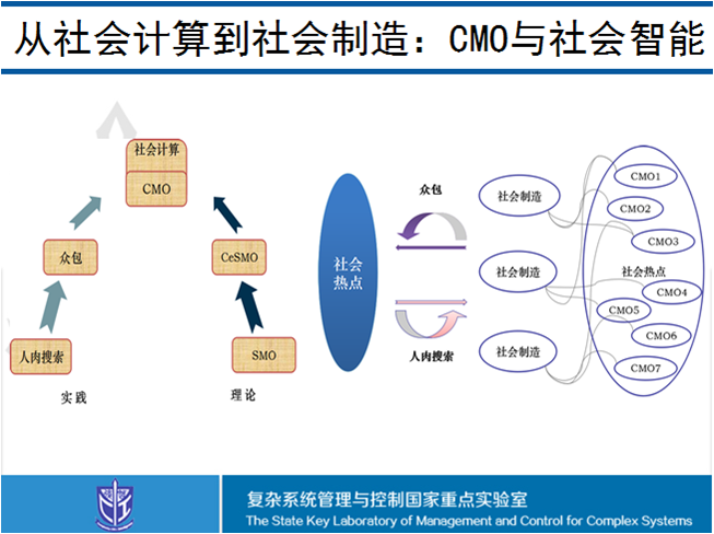 想要迈入智慧社会,还需要借助社会计算的手段,来主动实时地掌握社会需求,从而能够在大数据的时代环境下直接用数据考察研究各类问题。其中,CMO是感知并掌握社会需求的关键所在,这张PPT给出了如何通过“人肉搜索”或众包的方式完成从社会需求到社会制造的过程。